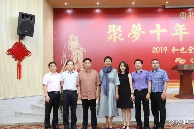 当时签约时倪萍还和品牌方来了一个大合影,她站C位。从此倪萍每年都参加和也商业推广,包括出席周年庆,每次都是站主位,成为品牌的形象大使。