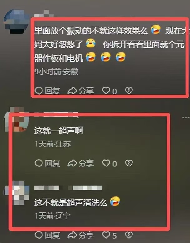 一发到网上去就直接兜不住了,网友说什么食材净化机呀,懂点常识的人都知道这就是一超声清洗的原理。只有大妈大爷好忽悠,还真以为洗出了脏东西。