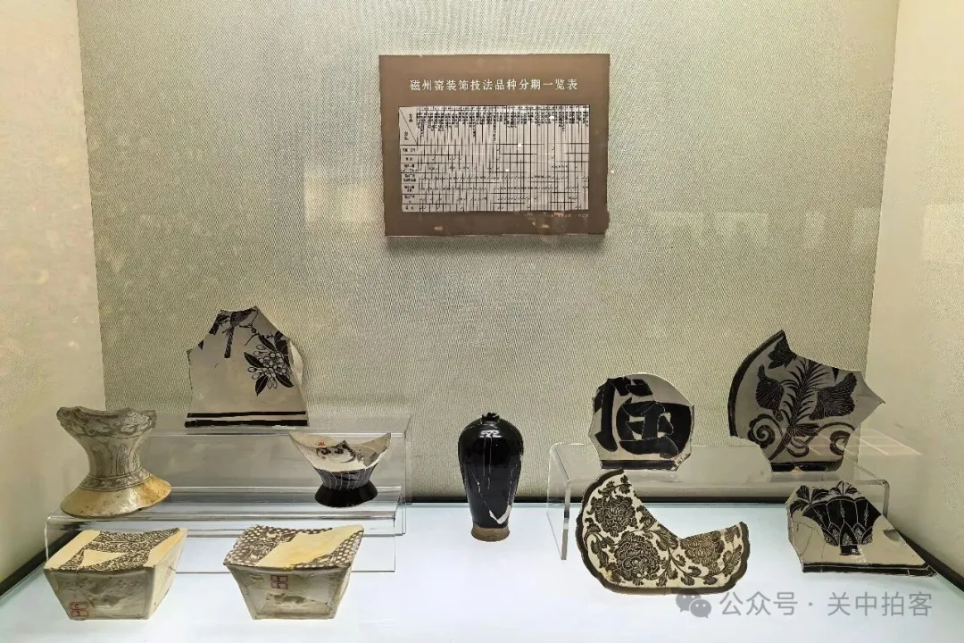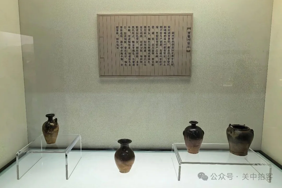 这里陈列着一件北齐高润墓出土的青釉鼓腹罐,跟临水窑出土的瓷器风格相似,胎质细腻,釉色青黄。隋唐时期,磁州窑发展成为北方重要的民窑,以生产白瓷、黑瓷、青瓷为主,种类丰富,器型多样。
