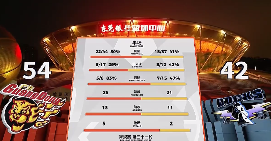 节中崔永熙下场轮休,张皓嘉回归,广东得分势头断崖式下降,斯佩尔曼、方硕发力连中2记三分回敬10-0,杜锋重新换回先发阵容,但徐杰打了不到2回合旧伤复发下场,广东队陷入巨大被动,关键时刻裁判吹罚阿基抢篮板犯规,斯佩尔曼周琦连续4罚不进,节末萨姆纳连续突破造犯规拿到6分帮助广东渡过难关,一直在进攻端没什么贡献的张皓嘉,还接锅飚进了压哨三分,半场打完,广东54-42北京!