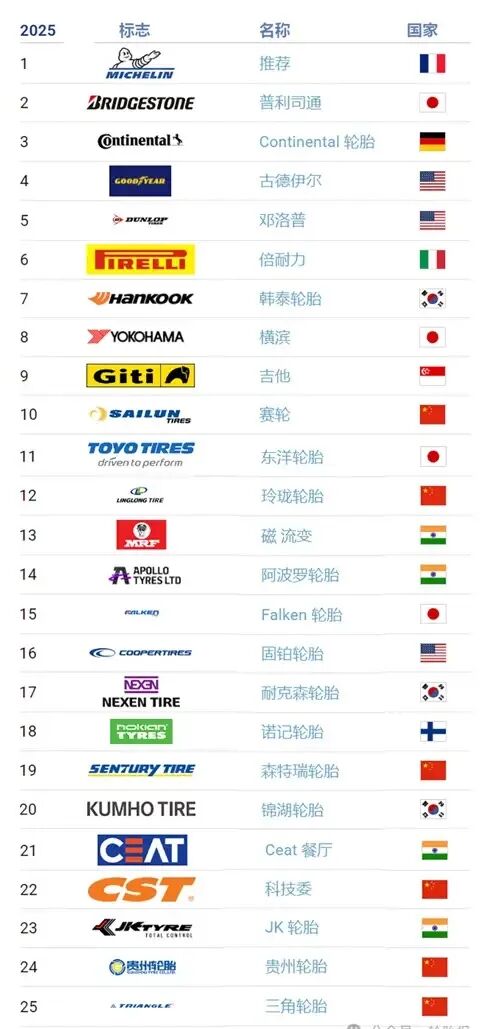 在2025年英国发布的全球轮胎品牌25强中,青岛赛轮以9.04亿美元成为我国迄今为止,第一家成功进入全球前10的轮胎企业;玲珑则以7.85亿美元的成绩排在第12名,森麒麟排在19名,三角为25名。
