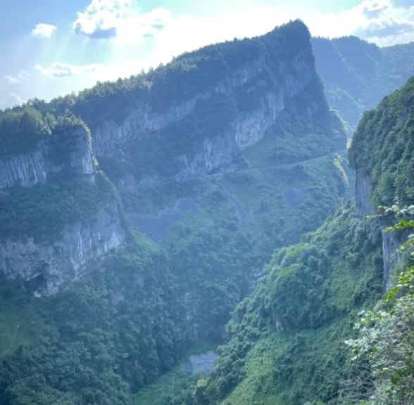步入景区,首先抵达的是天龙桥。这座桥桥高约235米,桥体厚重磅礴,以雄壮见长。桥洞形若古象,在它巨大的荫庇之下,坐落着一座青瓦灰墙的天福官驿。这座仿古建筑静卧于坑底,与四周的悬崖绝壁融为一体,平添一抹人文的幽思。继续前行,便来到了垂直高度达281米的青龙桥,这是三桥之中最为高峻的一座。当正午的阳光穿透桥洞,岩壁之上光影斑驳,宛如传说中青龙偃月刀的寒光。穿行于桥下,仰视拱孔高旷、壁立千仞的景象,能直观感受到自然力量塑造地壳的宏伟过程。