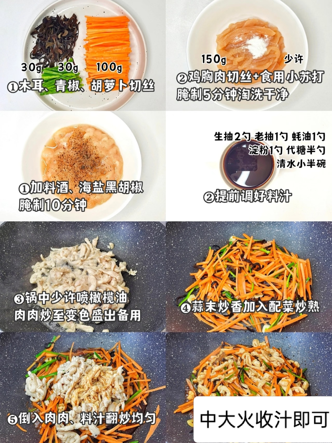 处理食材是这道菜成功的关键第一步。我们将150克鸡胸肉、100克胡萝卜、30克青椒和30克木耳分别洗净。为了让鸡胸肉的口感嫩滑而不柴,切肉丝时需要格外细心。切好的肉丝放入碗中,加入少许食用小苏打抓匀,腌制5分钟后用清水彻底淘洗干净。这一步能破坏肉的纤维,使其口感像嫩豆腐一样。洗净后的肉丝挤干水分,加入适量料酒、海盐和黑胡椒,再次抓匀腌制10分钟,让肉底味醇厚。