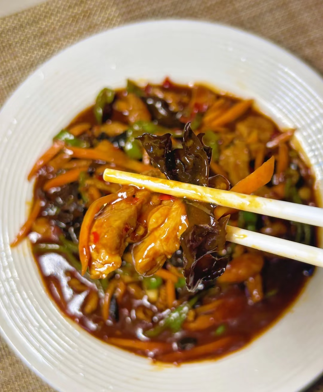 随着汤汁的收浓,各种食材的香气完美融合,一盘色泽油润、鲜嫩可口的鱼香肉丝便完成了。这道菜咸甜适中,口感丰富,每一口都能感受到鸡肉的滑嫩与蔬菜的清脆,既解馋又无负担,绝对是餐桌上的一道点睛之笔,让人吃完之后仍觉回味无穷,感叹健康饮食原来也可以如此美味。