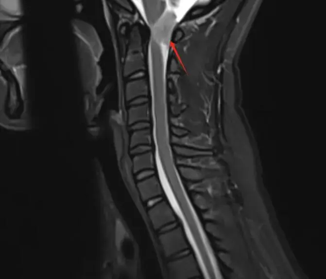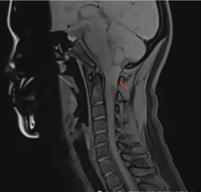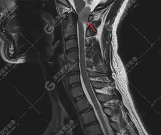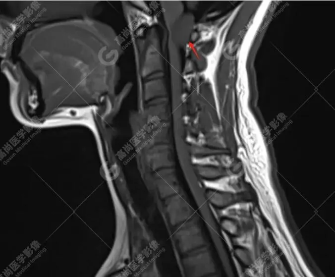 检查所见:检查发现其C1椎体-向上枕大孔上部水平椎管髓外硬膜下占位,考虑是脊膜瘤。
