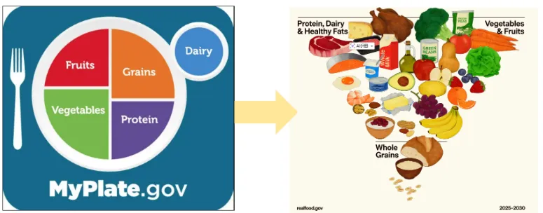 2026年1月7日,美国农业部(USDA)、卫生与公众服务部(HHS)联合发布了《美国膳食指南2025-2030》,这是该国历史上最富争议性的一次营养政策调整。与2020-2025版相比,新版指南的核心理念从“吃什么”转向“怎么吃”,从推崇多年的“低脂高碳”转向强调“优脂、足蛋白”,展现出与往届截然不同的气象。
