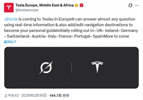 2 月 19 日消息,特斯拉 EMEA 区域官方 X 账户本月 16 日表示,由其“同门”xAI 提供的 Grok 人工智能服务将登陆欧洲市场的特斯拉电动汽车,首批率先在英国、爱尔兰、德国、瑞士、奥地利、意大利、法国、葡萄牙、西班牙这 9 个国家推出。