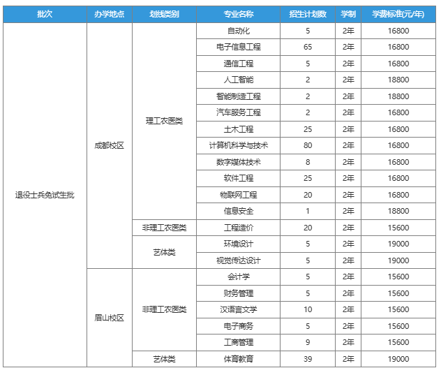 就读校区包括成都校区和眉山校区,学制为2年,学费有15600、16800、19000元/年。