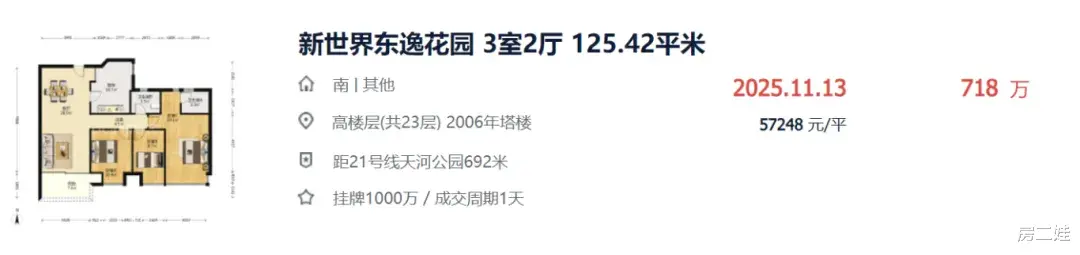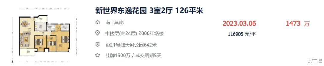 上几组扎心数据:新世界东逸花园125㎡三房,2023年上半年成交价1473万(单价11.6万/㎡)。