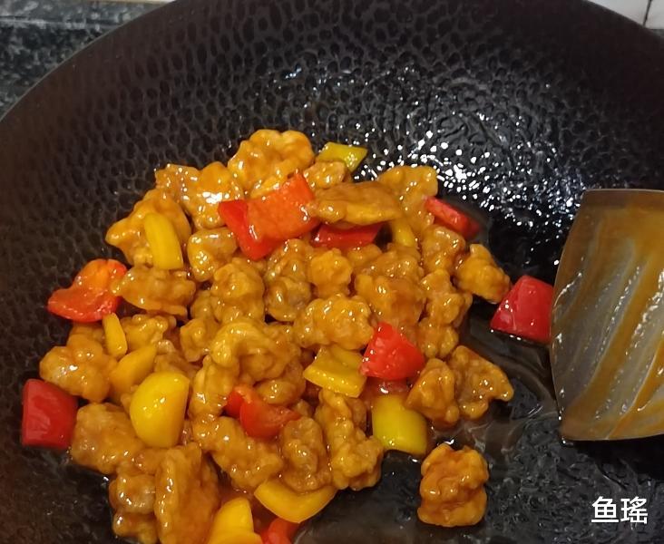 进入“炸炸炸”环节。锅里倒油,油量要嚣张——能没过肉块1cm,烧至六成热(木筷插入冒小泡),把里脊一颗一颗滑下去,像下彩色汤圆。先炸90秒定型,外壳浅黄就捞出,升高油温到八成热,再回锅30秒“复炸”,外壳瞬间从“哑光”升级“高光”,颜色像刚烤过的面包。彩椒和洋葱也过5秒油,时间千万别贪,它们只是去“蒸桑拿”,保持“咔嚓”就行。炸完关火,把油往边上一推,锅留一勺底油即可。
