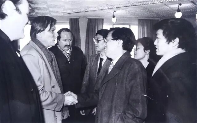 (图一、八十年代,金弢(右)陪同王蒙部长在京会见西德作家)