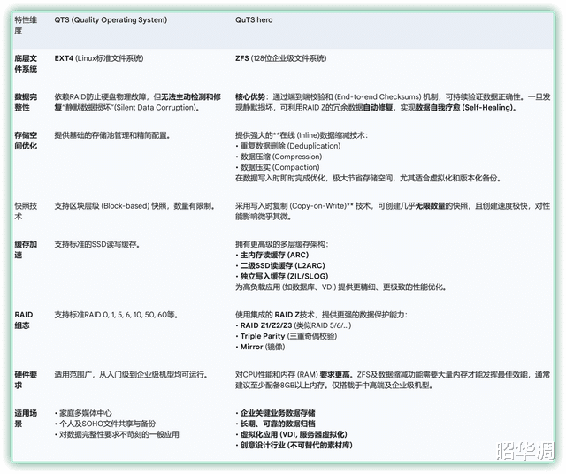 ▼QuTS hero 系统与 QTS 的核心区别,在于它引入了更安全的 ZFS 文件系统(QTS 仍采用 Ext4)。ZFS 带来了革命性的数据完整性保障,具备强大的数据校验、实时快照、高效压缩和重复数据删除等高级功能,尤其适合那些对数据安全、存储效率有极致要求的专业用户。