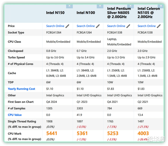 ▼性能方面,Qu605 搭载 Intel N150 处理器,4 核心 4 线程,最高睿频达到 3.6GHz,并集成 6MB 三级缓存, TDP 功耗在 6W 至 25W 之间动态调节,内置的 24EU 核显也为图形处理提供了支持。