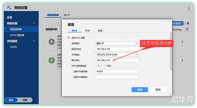 ▼利用虚拟机搭建好软路由,想让威联通上网,只需在网络设置这里选择静态地址,默认网关填入软路由的 IP 即可