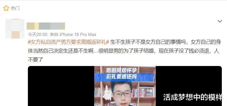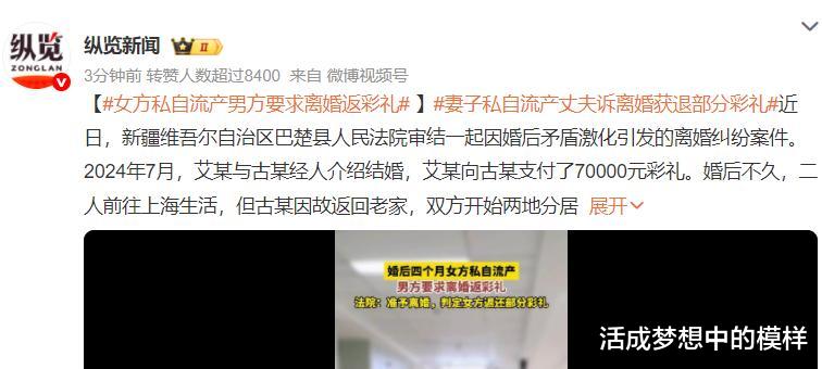 近日,一则女方私自流产男方要求离婚返彩礼的话题上了热搜,大概就是男方支付7万彩礼结婚,妻子吵架后直接私自流产了,男子于是要求离婚并返还彩礼。