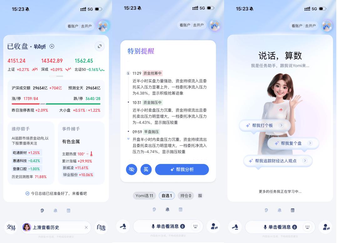 AI涨乐其实在这方面下了很多功夫,比如把数字人的拟人化陪伴,融入到日常的行情解读、交易引导、信息推送等环节里,要的就是增强产品的易用性,给普通人提供出更愿意接收消化信号的体验感。