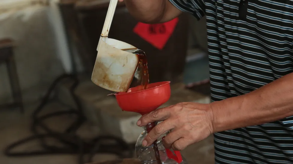 熏醋的主原料为玉米及玉米胚芽,辅以米糠、高粱等粗粮与花生皮、红枣,研磨后,经过蒸、酵、熏、淋、陈等古法工艺,从下料到出醋,大致四五十天。一瓶瓶色泽清亮的熏醋,只需轻轻旋开瓶盖,浓郁的香气便扑鼻而来。抿一口,顿觉酸中带甜,回味绵长。