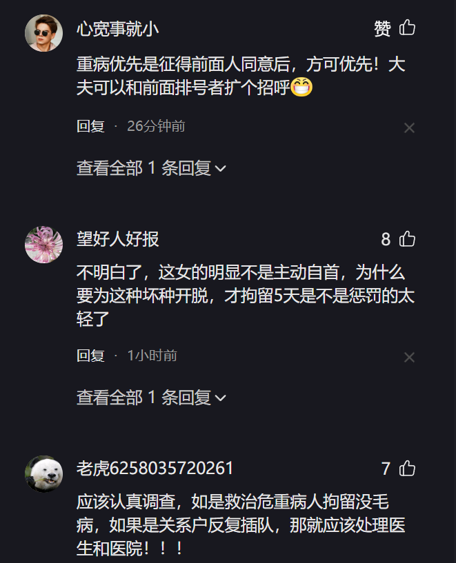 有网友说,这个医生有责任,应当向先来又让人家等待时间过长患者解释一下,说明为什么要先抢救重症患者,沟通才是解决医患矛盾最好渠道。医生患者应换位思考一下。