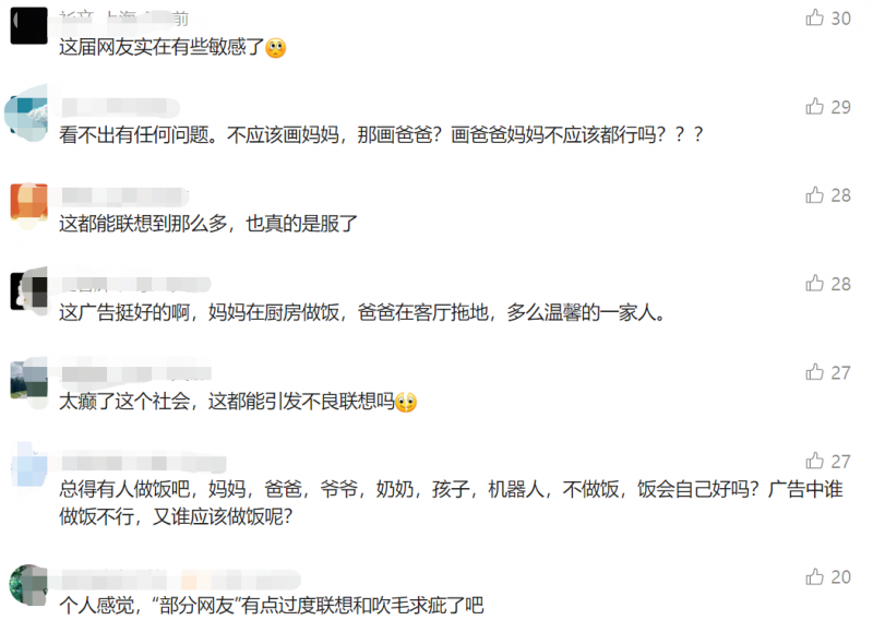 其次,争论的另一焦点转向对批评本身的评判,即争议是否始于一场“过度解读”。另一家媒体《南方都市报》的线上调研则反映了类似倾向,大多数参与网友认为这是“过度解读,广告本意是体谅母亲,无需上纲上线”。持此观点的网友强调,广告仅仅是截取了一个现实生活片段进行艺术化表达,将其上升到“固化刻板印象”的层面是矫枉过正,反映了舆论环境中存在“小题大做”的现象。