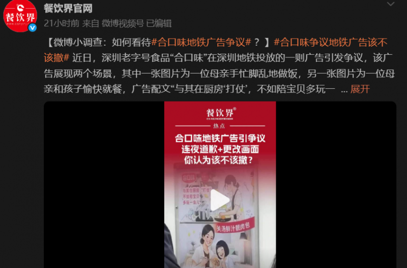 广告发布不久,有网友拍摄该广告画面发布在社交平台上,并指出内容容易让人产生“不良联想”,认为画面“将家务和育儿天然归类于母亲”。该观点得到部分网友支持,他们认为广告存在强化性别刻板印象的嫌疑,由此引发热议。短时间内,微博、小红书等社交平台上,涌现出“合口味地铁广告被指引发不良联想”“合口味地铁广告被指加深刻板印象”等多个热议话题。