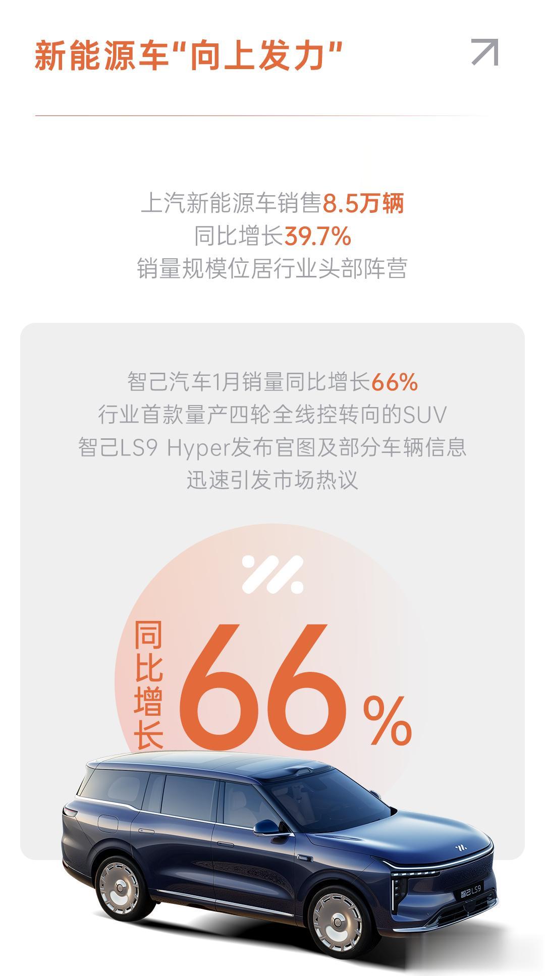 新能源车“向上发力”。今年1月份,上汽新能源车销售8.5万辆,同比增长39.7%,销量规模位居行业头部阵营。其中,智己汽车1月销量同比增长66%,行业首款量产四轮全线控转向的SUV——智己LS9 Hyper发布官图及部分车辆信息,迅速引发市场热议;上汽乘用车销售新能源车2.8万辆,同比增长576.9%;上汽大通销售新能源车0.4万辆,同比增长24.6%;上汽通用销售新能源车0.6万辆,同比增长316.1%;上汽通用五菱销售新能源车3.6万辆,新上市的“全能硬派大空间SUV”星光560订单火爆。