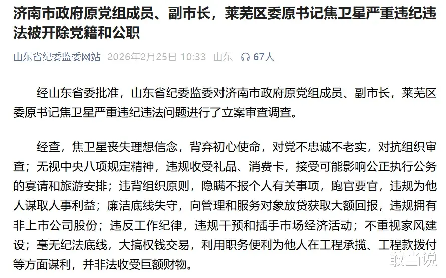 2月25日,山东省纪委监委公布了对济南市政府原党组成员、副市长,莱芜区委原书记焦卫星严重违纪违法问题的审查调查结果,并对其作出开除党籍、开除公职的“双开”处分决定。这一案例不仅是反腐败斗争中又一记重拳,更是一面映射出部分领导干部在理想信念、纪律规矩、权力运行等方面全面失守的警示镜鉴,深刻揭示了新时代推进全面从严治党、深化反腐败斗争的必要性与紧迫性。