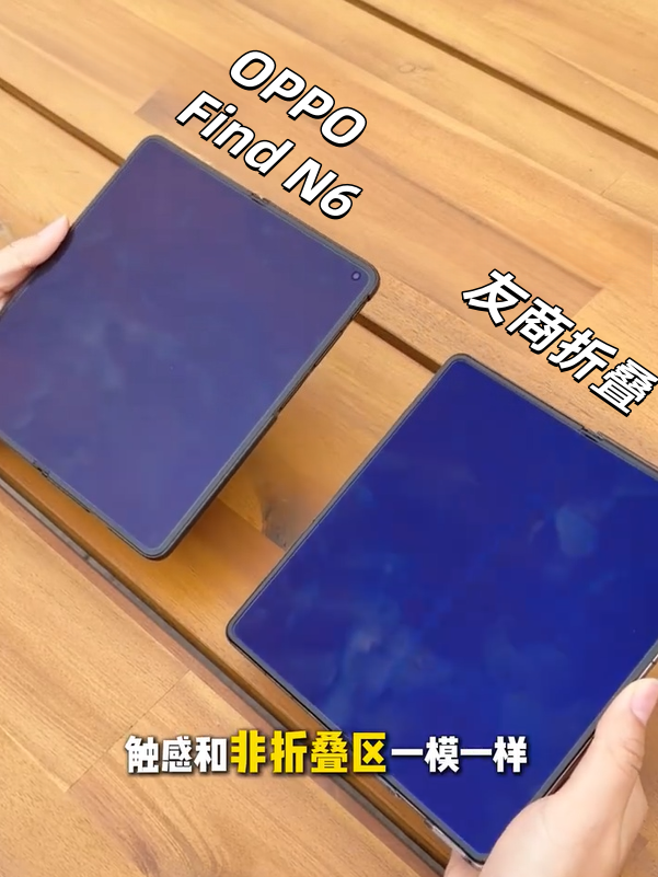 不是我吹,现场对比图真的太残忍了:友商旗舰的折痕明晃晃一条沟,Find N6这边一马平川,平整得像直板机!德国莱茵那个「全球最平整折叠屏」的认证,真不是白给的——0.1mm折痕深度是什么概念?比头发丝还细!