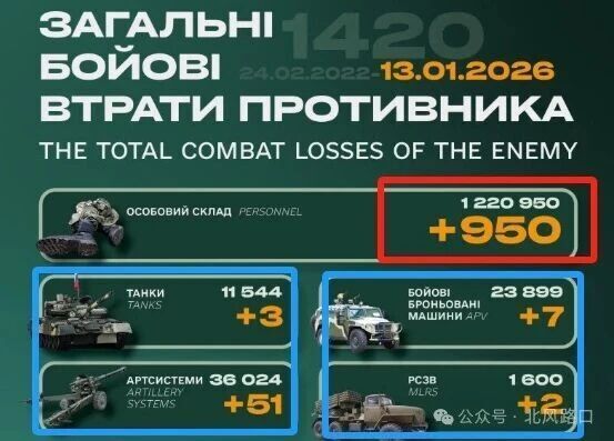 6、【新纪录诞生,俄军损失超过122万】1月13日,乌克兰总参谋部发布俄军损失数据,俄军损失新增950人,累计损失超过120万,达到1220950人。
