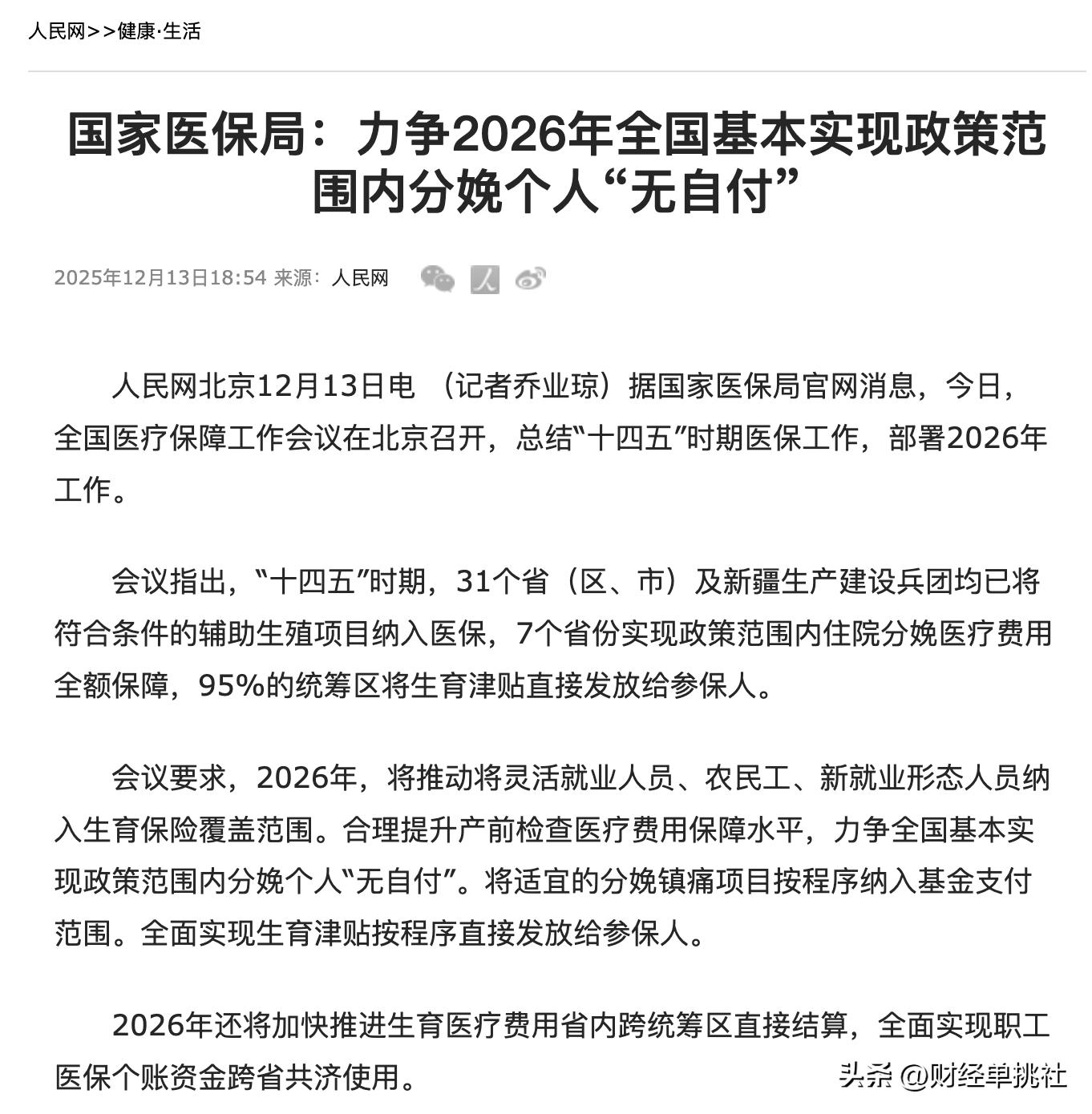 这两天,又有一条促生政策有望落地了。国家医保局在全国医保工作会议上说,要力争到2026年,全国基本实现政策范围内分娩个人无自付,也就是在公立医院按规定生孩子,符合生育保险和医保目录的那一部分费用,争取做到你自己不用掏钱。