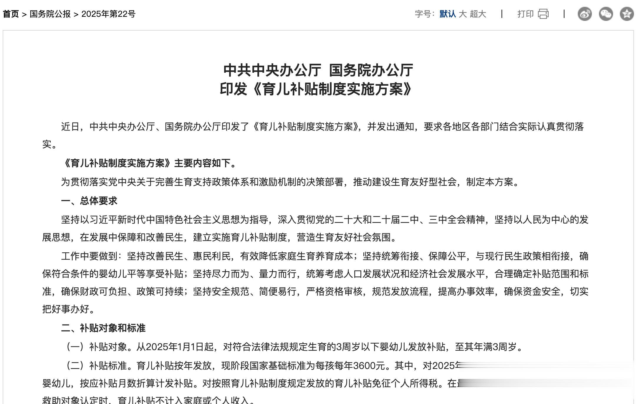 前面一段时间,中办、国办刚刚印发《育儿补贴制度实施方案》,从2025年1月1号开始,对3岁以下的孩子,每年发3600块钱育儿补贴,发到满3岁,中央财政还专门为此预算了大概900亿元,通过转移支付的方式下到各地。现在已经陆续有很多省市的居民收到补贴了。