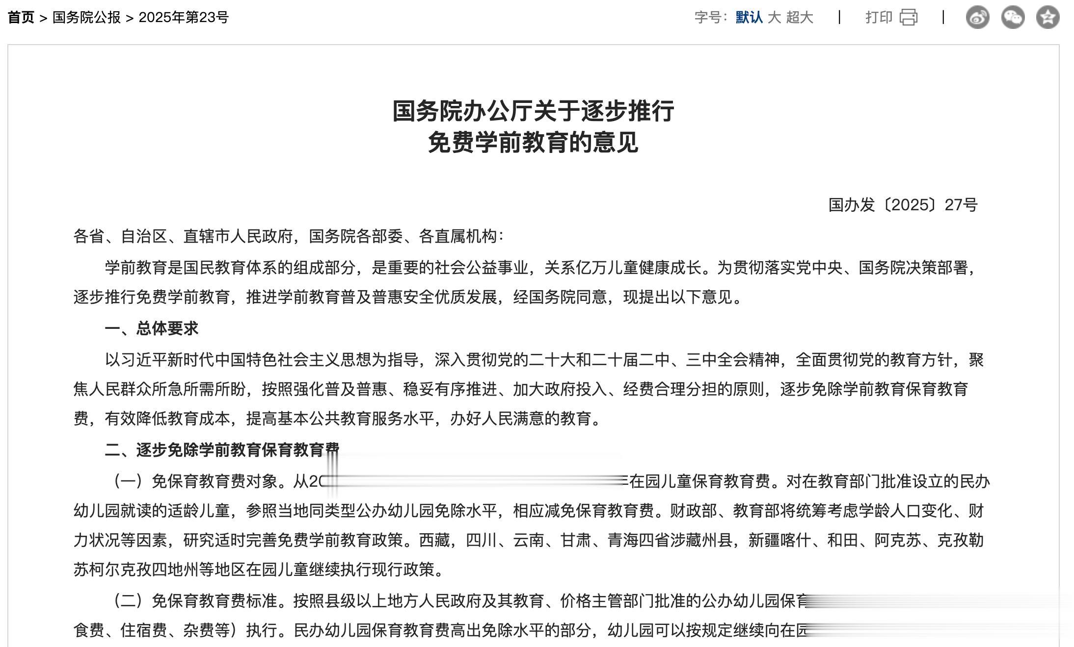 8月份,国务院办公厅又发了《关于逐步推行免费学前教育的意见》,从2025年秋季学期起,全国范围内免除公办幼儿园学前一年保教费,对民办幼儿园按当地公办园标准减免费用,教育部估算,这一条一年能覆盖大概1200万孩子。