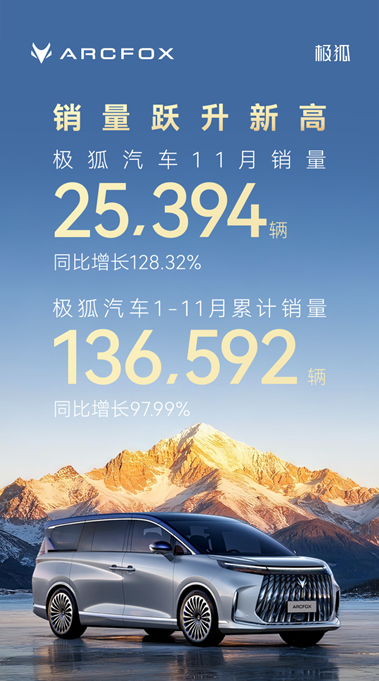 11月,极狐汽车再次交出了一份“2万+”的销量答卷:整月共售出25394台车,同比增长128.32%。