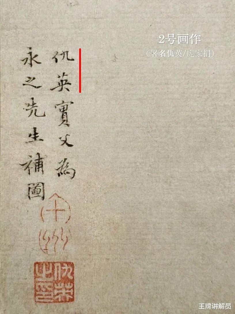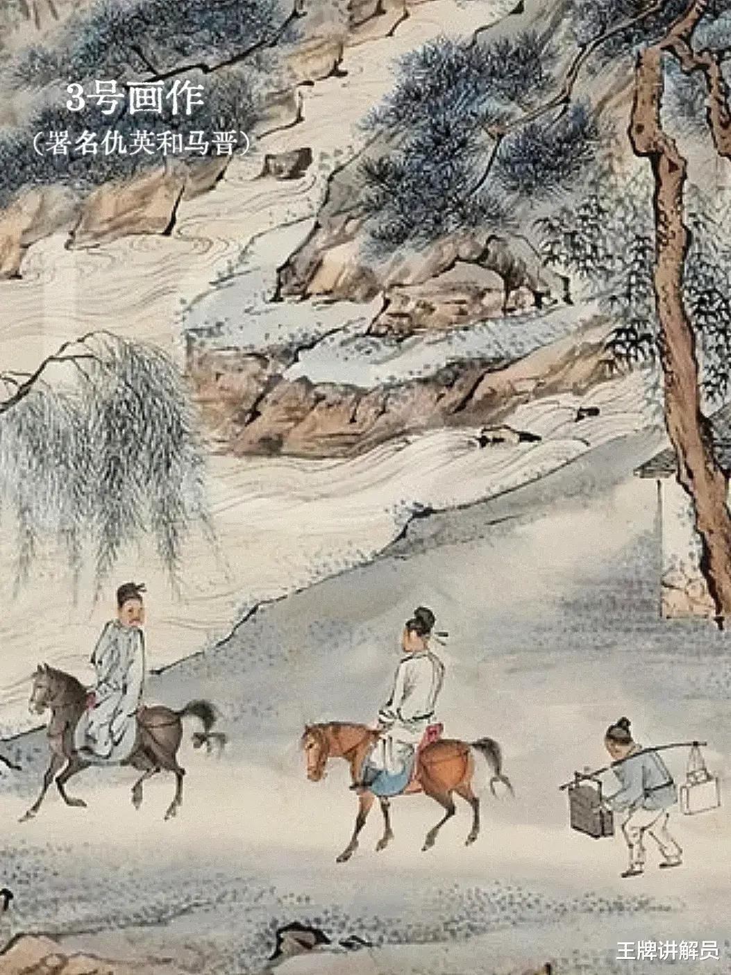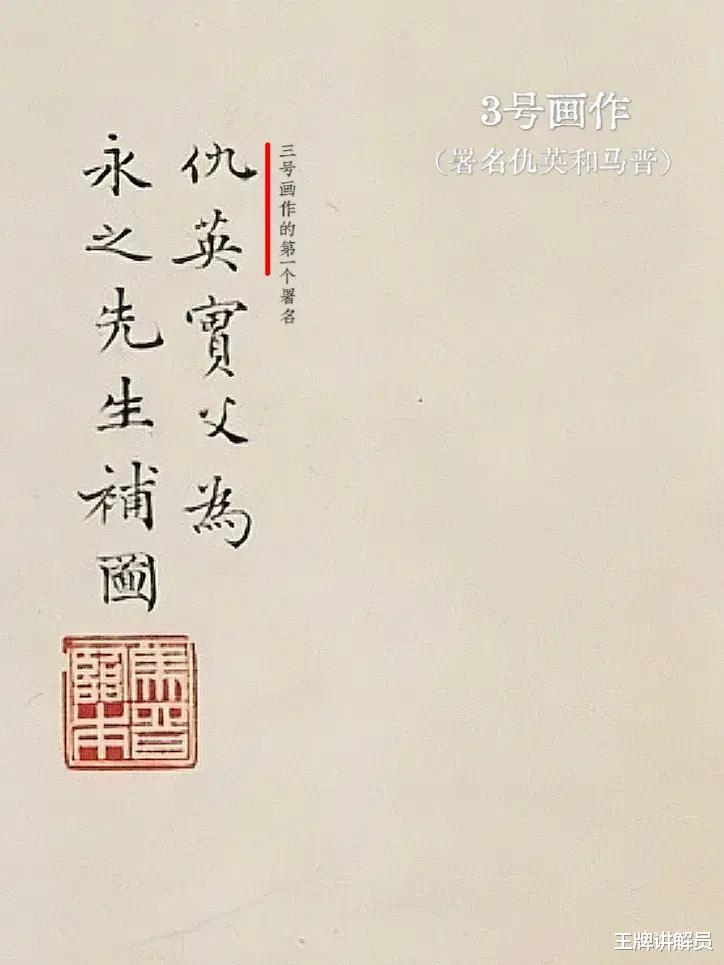 3号画作被私人收藏,同样画在纸上,署了两个名字——画面上的署名是“仇英”,题跋后面还有一个署名“马晋”。其中,“仇英”署名与2号几乎一模一样。