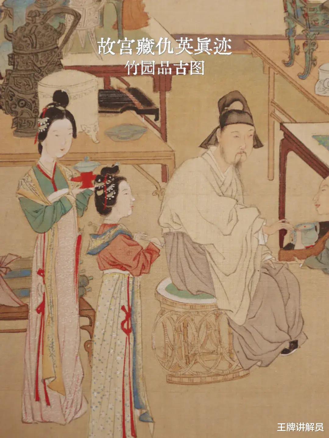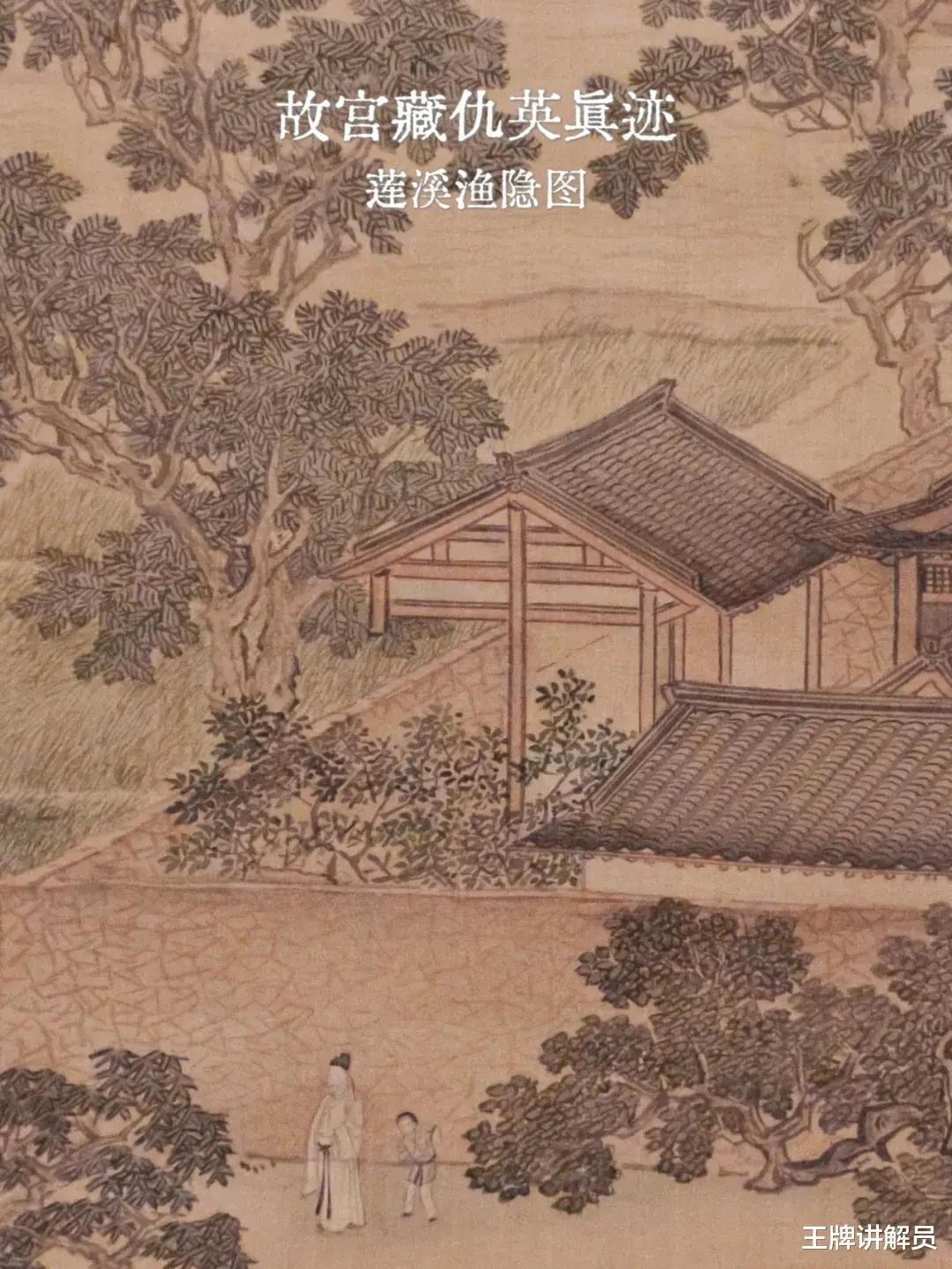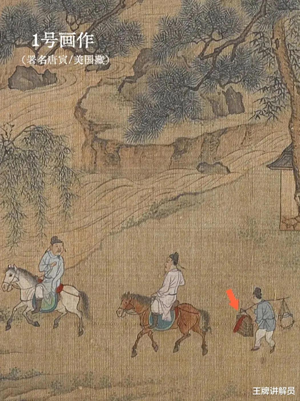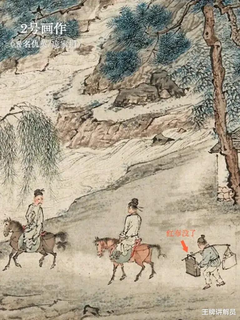 但两幅画的风格不同,1号画作(署名唐寅/美国藏)更精致,细节更丰富。1号画作里的部分细节,比如担子上的红布、楼阁里的坐墩,被2号画作(署名仇英/庞家捐)省略了。一般来说,时间越早的画作,细节越丰富,所以2号画作给人一种临摹1号的感觉。