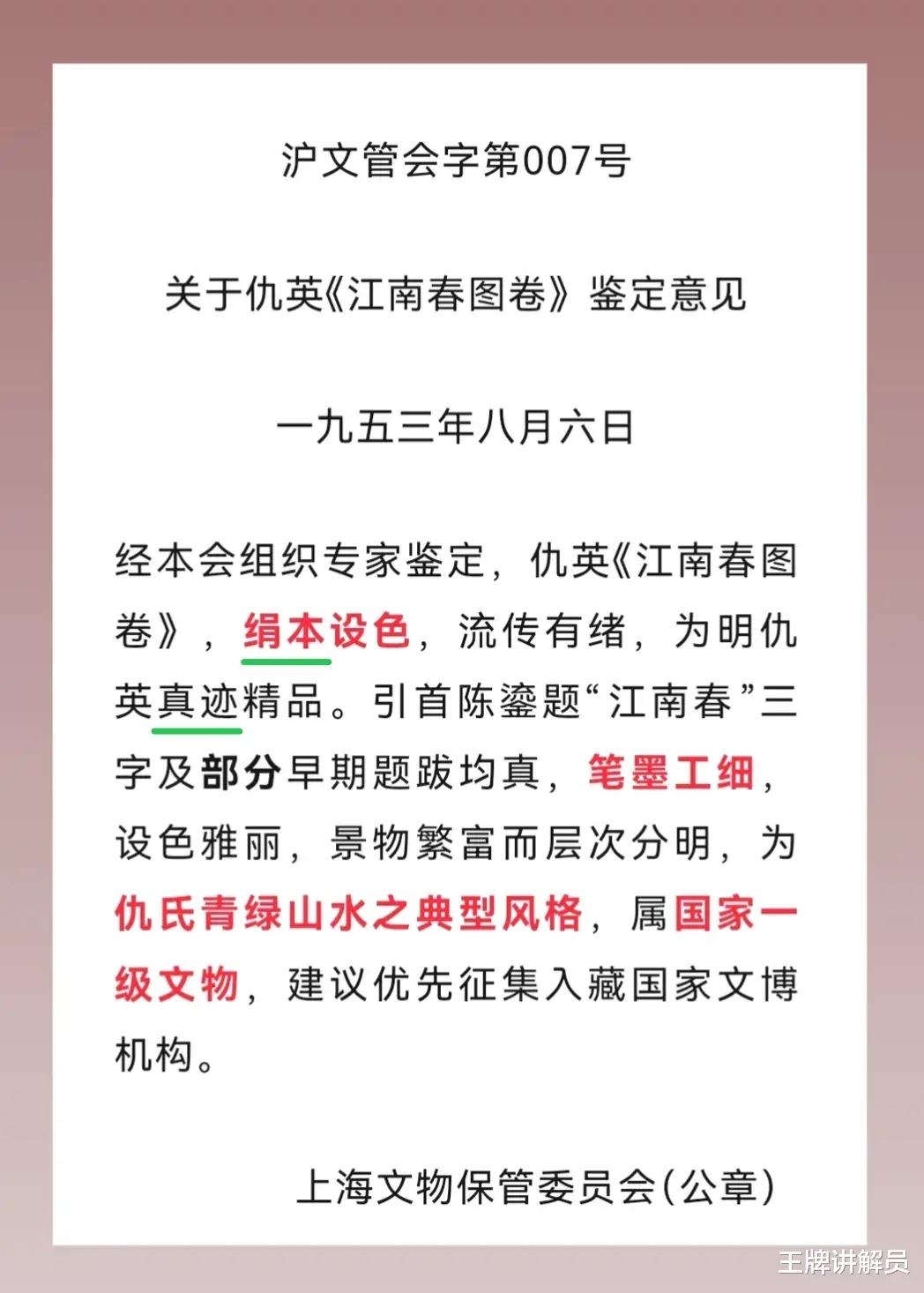 鉴定意见明确写道,画是仇英真迹,是精品,是仇英青绿山水的典型风格。