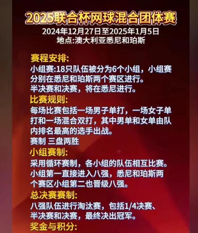 联合杯是一项极具特色的赛事,将于12月27日至2025年1月5日在澳大利亚的悉尼和珀斯展开。本届赛事汇聚了18支国家队,采用创新的混合团体赛制。参赛队伍被分为六个小组进行循环赛,每场对决包含男单、女单和混双三个项目。各小组第一名和最佳第二名将晋级八强,随后通过淘汰赛决出最终冠军。值得一提的是,在上届比赛中,中国队展现出色实力,以3-0横扫捷克队,虽然之后在面对德约科维奇领衔的塞尔维亚队时以1-2惜败,但仍然成功闯入八强。