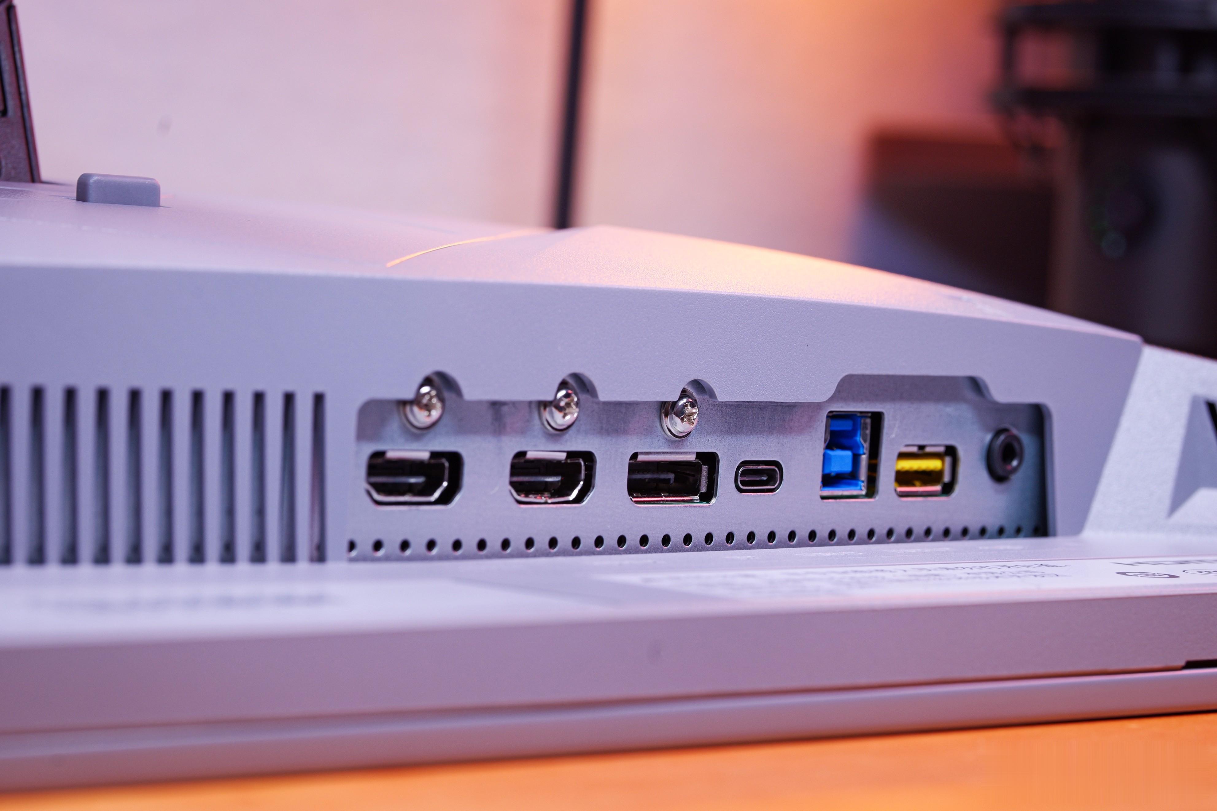显示器下方配备两个USB-A 3.2接口,可随时接驳键鼠、U盘等外设,即插即用更省心。背面接口布局丰富,包含DP 2.1、双HDMI 2.1、全功能USB-C及多个USB接口,满足PC、主机、笔记本等多设备的连接需求,拓展性拉满。