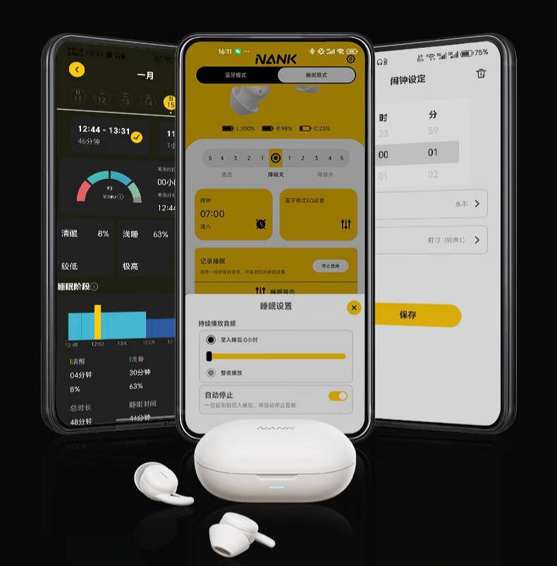 在降噪方面,南卡DeepSleep对高、中、低频噪声都有针对性优化。高频杂声借助ANC分频引擎得到有效抑制,中频人声被自然隔离,低频呼噜与空调声则通过BioShell三层仿生腔体缓解。双耳6麦阵列可360°捕捉环境音,让干扰噪声被稳稳拉开,安静感平滑连贯。配合NANK DeepSleep算法的APP,可实时追踪深睡、浅睡和清醒状态,同时记录睡姿和入睡自动停播,并生成可视化睡眠报告,让降噪和助眠更有数据支撑,更科学可靠。
