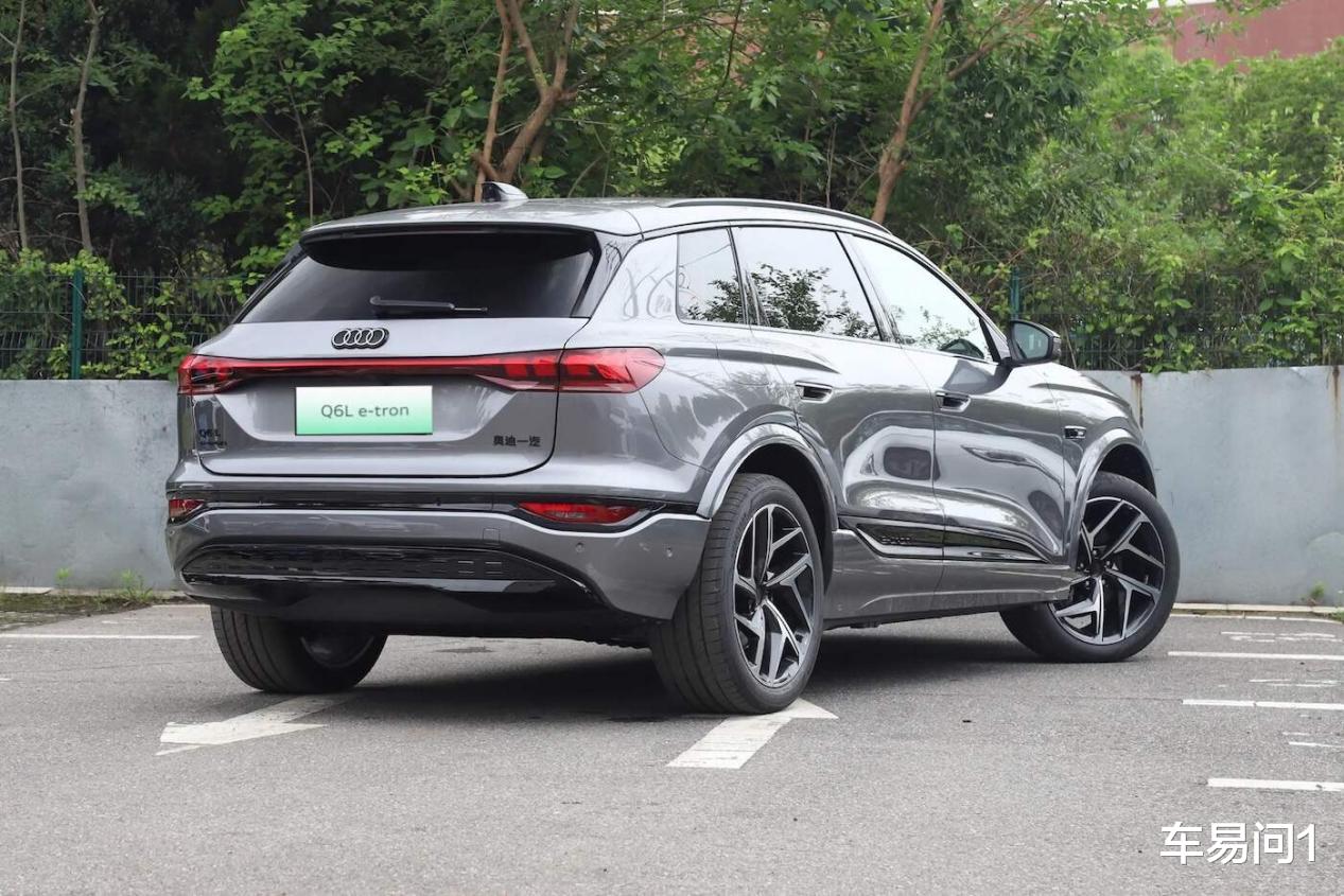 从侧后方向看,奥迪Q6L e-tron的贯穿式尾灯与新一代奥迪Q5L高度相似,只是边角处置还要更规整一些。同时,包括车辆的外后视镜盖、半隐藏把手、独立轮眉等等,都与奥迪Q5L相似。不过,新车还有了多层保险杠运动处置,尽管没有像奥迪Q5L那样的内扩散器造型,但上下的分层贯穿、底部的镂空运动护板,依旧让奥迪Q6L e-tron显得是饱满且个性化。
