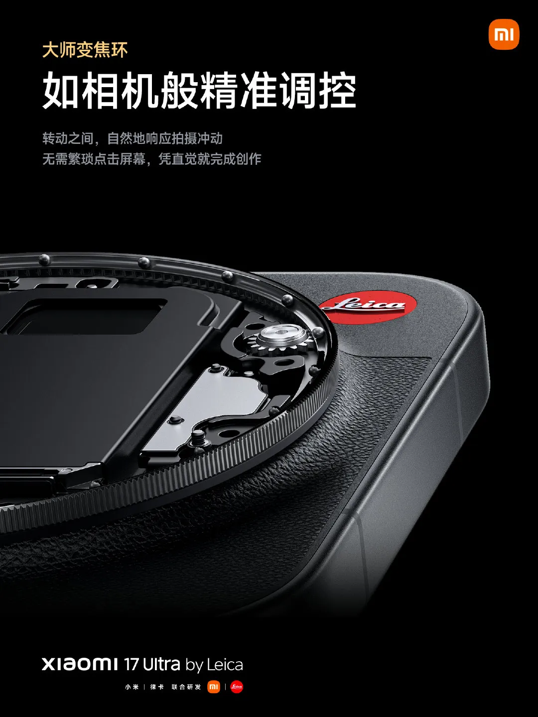 有趣的是大师变焦环的配置,其意义在于“机械灵魂在数字时代的回归”。我们常说,影像创作的伟大瞬间,往往诞生于念头闪过的毫厘之间。为了让操控回归直觉,让创作者沉浸于心流状态,小米17 Ultra by Leica带来了移动摄影领域首款“大师变焦环”。这一设计传承了相机史上最为经典的操控逻辑,将百年影像积淀的使用习惯,无缝移植到掌中设备。它安静地卧于DECO最自然的位置,为原本二维的触控交互增添了物理维度——只需轻轻转动,便能响应最原始的创作冲动,让变焦过程本身成为一种充满愉悦的肢体记忆。这种设计思维的突破,让手机不再是冰冷的数码产品,而拥有了如机械腕表般可把玩、可感知的灵魂。