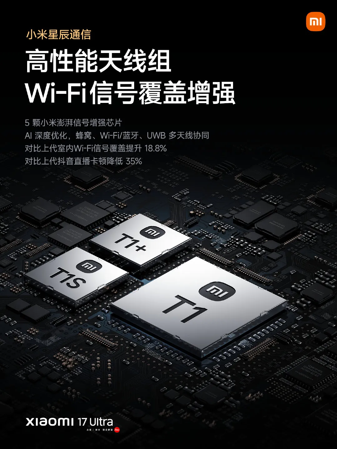 T1P信号增强芯片为全频段信号增强提供了坚实的技术支撑,它打破了传统天线调谐器仅支持单一频段的局限,提升天线在复合状态下的灵活切换能力,实现多维度的天线复用与协同。其信号强度、稳定性及覆盖率,均迈入了全新水平。这种硬件层面的突破,让小米17 Ultra在地下室、电梯、高铁等传统信号盲区依然保持稳定的连接。