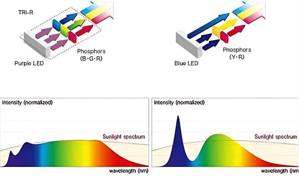长期暴露于蓝光环境中,尤其是450nm蓝光,会增加视网膜损伤的风险。紫光激发的护眼灯能够有效降低蓝光对视网膜的伤害,因为紫光激发技术避免了450nm的高能蓝光峰,并且光谱中的紫光波段具有良好的生物学效应,可以进一步保护眼睛的健康。