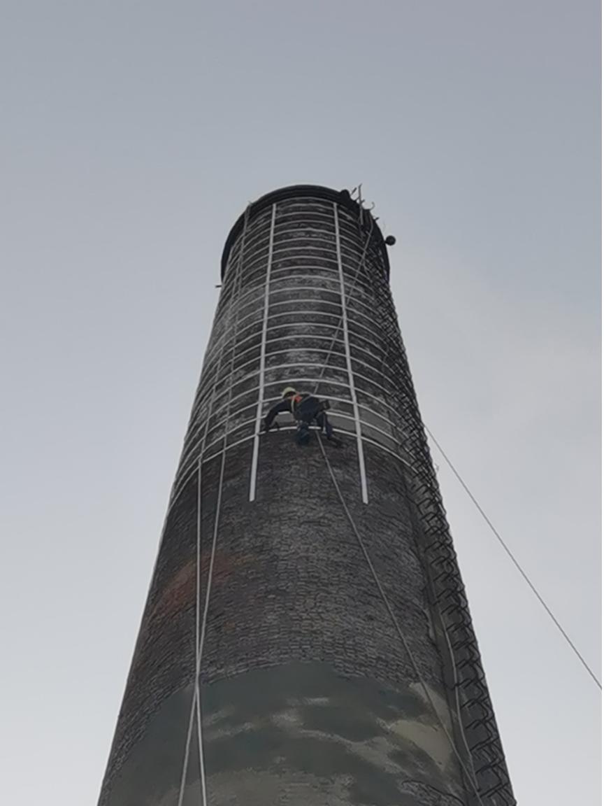 2.现场踏勘与烟囱本体预检整改。用全站仪检测烟囱垂直度,偏差需≤0.5‰,超差先做纠偏处理。全面排查筒壁裂缝、酥松砖体及空鼓部位,宽≥2mm 裂缝开槽灌注环氧树脂砂浆封堵,窄裂缝用胶泥封闭,剔除酥松空鼓砖体后用 M10 耐碱砂浆补砌。彻底铲除筒壁浮灰、青苔、盐霜,高压水枪冲洗晾干至含水率≤8%。搭设环形满堂脚手架或合规吊篮,做好防风加固与安全防护,验收合格后方可投入高空作业。
