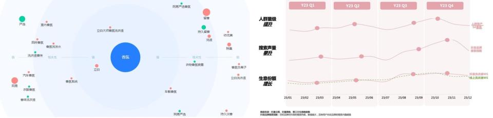 从巨量算数平台数据来看,“香氛”的搜索关联词中,「立白大师香氛」位于核心内环,足见这款香型在香氛市场上的瞩目程度;进一步从年份跨度上来看,不论是人群、声量还是生意份额,「梦幻格拉斯玫瑰」香氛洗衣液均领先市场,增长迅速,“年度趋势香”实至名归。