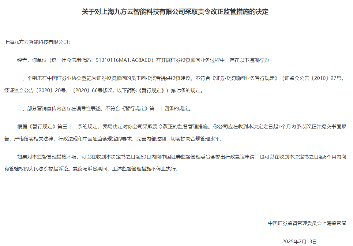 其实,对于九方智投存在的相关问题,监管部门已经发现了。早在今年2月份,中国证监会上海监管局就发布了一份公告,称九方智投的子公司上海九方云智能存在无投顾资质员工向投资者提供投资建议、部分营销宣传内容存在误导性表述等违规行为,责令其改正。