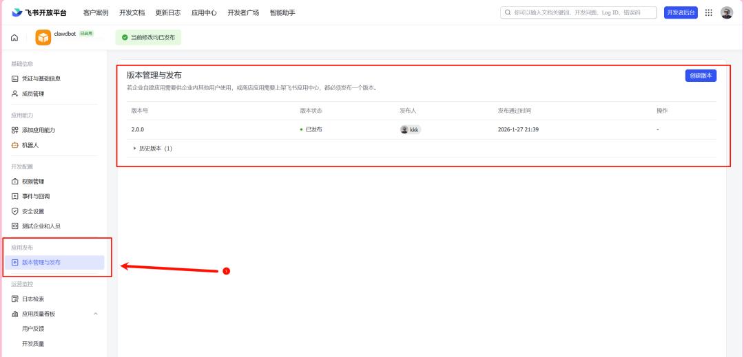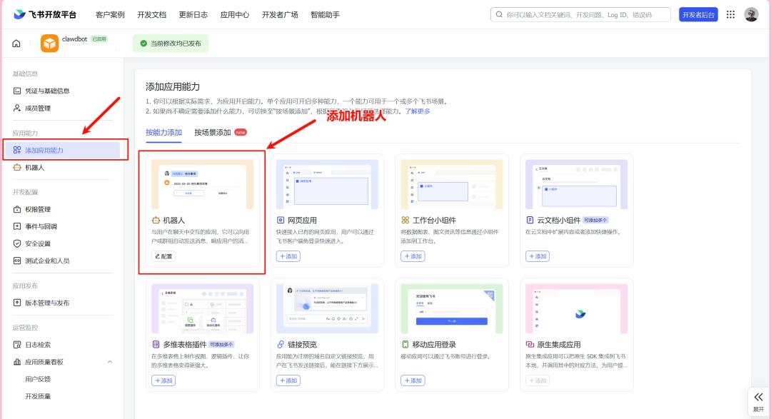 然后就是飞书开放平台自己的一些设置了,这个就不太好上AI了,而且也不复杂,大家先把机器人加入进去。