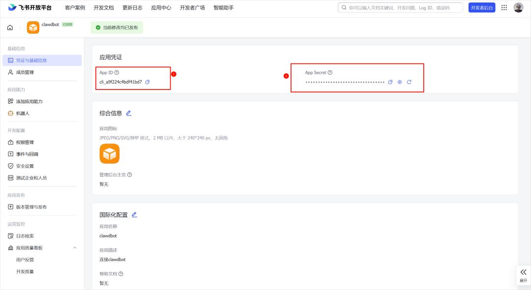 他说装好了之后,还需要去飞书开放平台(open.feishu.cn)建个应用,把App ID和App Secret记下来,接下来要用到,也是关键的一步。