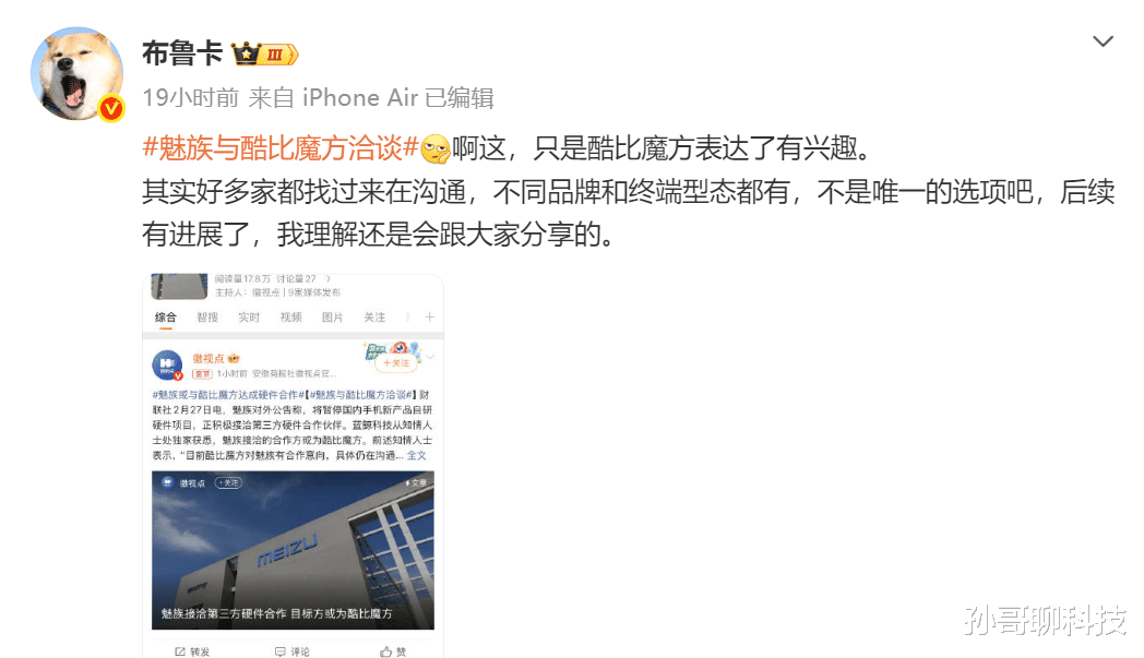 魅族员工布鲁卡爆料,目前不止一家厂商与魅族展开洽谈,其中包括酷比魔方等厂商,不同品牌的终端形态都有。酷比魔方不是唯一选择,后续如果有其他进展,会继续和大家分享,说明至少魅族具有一定价值,友商想要获得魅族底层赋能。