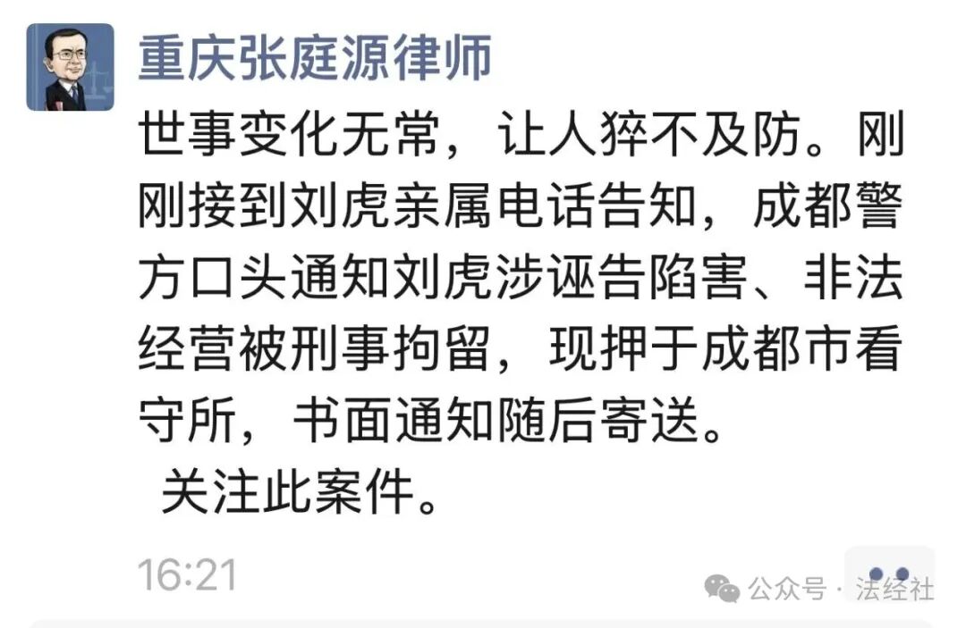这篇文章发表之后,刘虎接到纪委监委人员发来的短信,请他协助核实相关情况。有消息称,文中所涉的县委书记,实名向警方报案,称该文涉嫌诬告陷害。2月2日晚间,锦江区公安分局通报,接成都市公安局指定管辖,依法对刘某(男,50岁),巫某某(男,34岁)等人涉嫌诬告陷害罪和非法经营罪立案侦查,案件正在进一步侦办中。刘虎1975年9月生,重庆万州人,曾任《新快报》记者,实名报道或撰文报道过华润集团原董事长宋林、海南省高级法院原副院长张家慧等案。早在2013年,他因一起诽谤案被逮捕,一度进入司法程序。