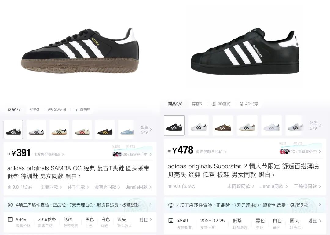 进一步观察营收结构,作为营收主力的鞋类业务,其2025年前三季度的平均增速较2024年同期有所放缓。同时,曾为增长核心引擎的明星产品Samba德训鞋,在社交平台的热度已明显减退。在小红书上,关于Samba的讨论高峰多停留在2024年至2025年初;在得物等二级市场,截至发稿,其经典黑白配色的热门尺码价格已回落至400元以下,较发售价下跌约54%。而被寄予接棒期望的Superstar系列,目前的市场反响也尚未达到Samba曾经的高度。在二级市场上,Superstar 2部分款式的价格较发售价跌幅已超过三分之一。